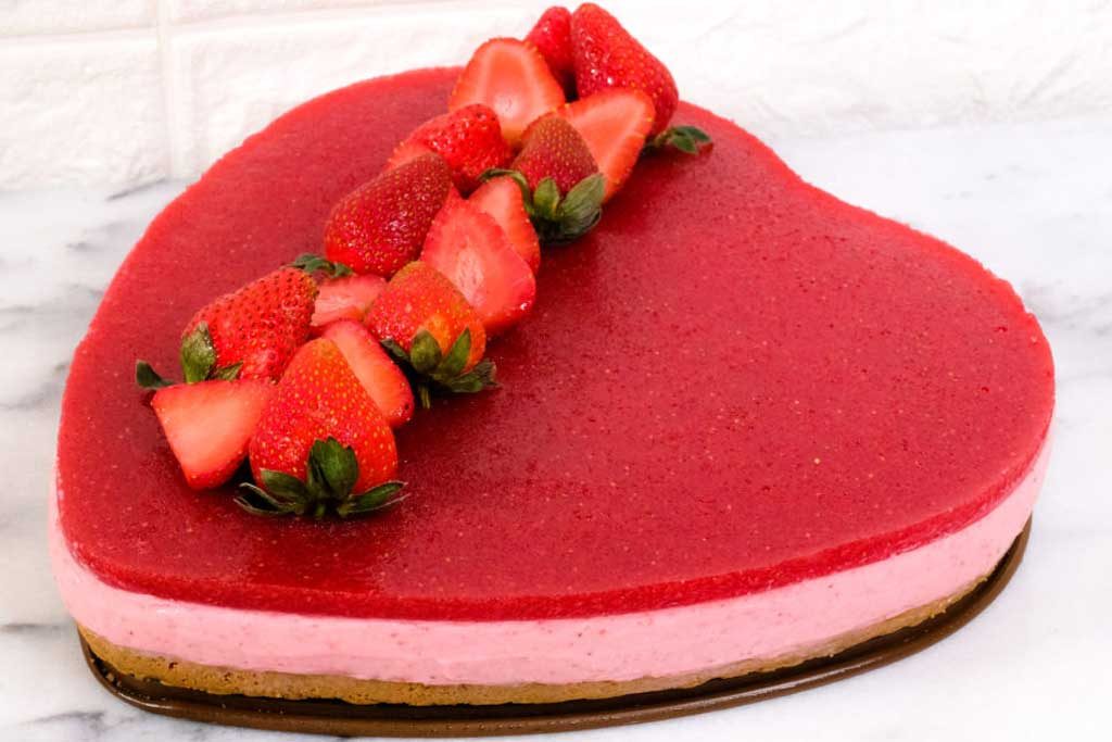 - Remove the cheesecake from the pan and garnish with fresh strawberries.
