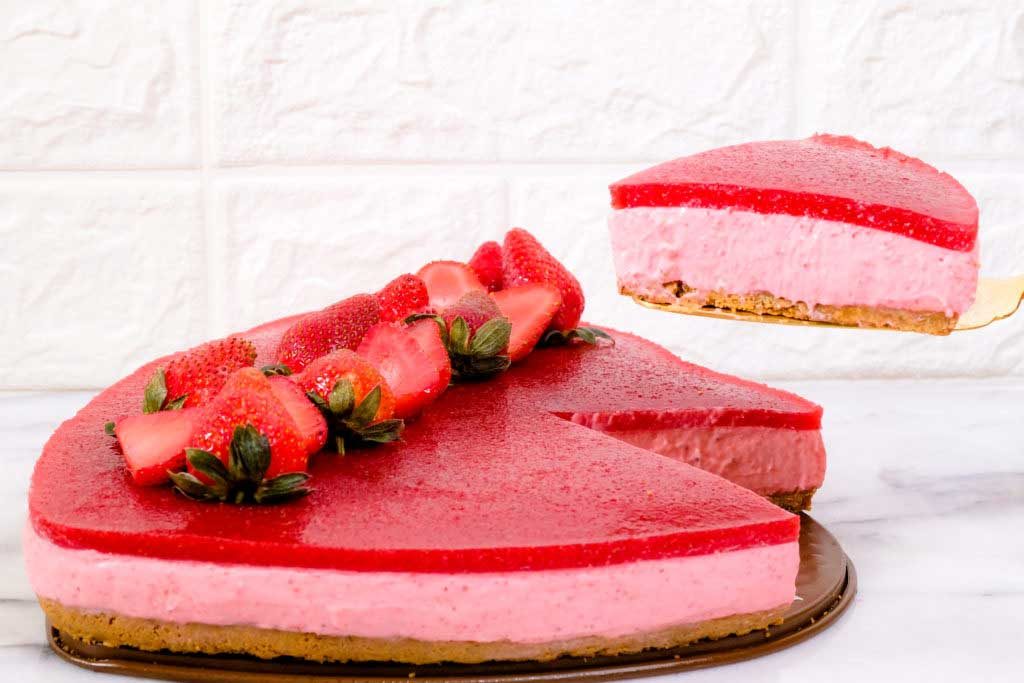 This strawberry cheesecake is easy to make and bursting with strawberry goodness! It has a creamy mousse texture that is absolutely mouthwatering.